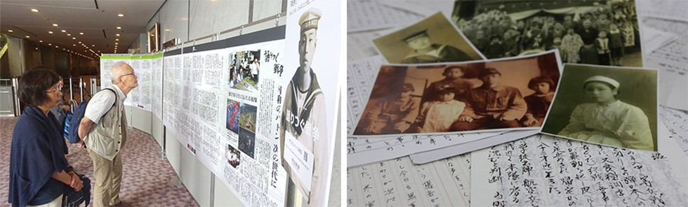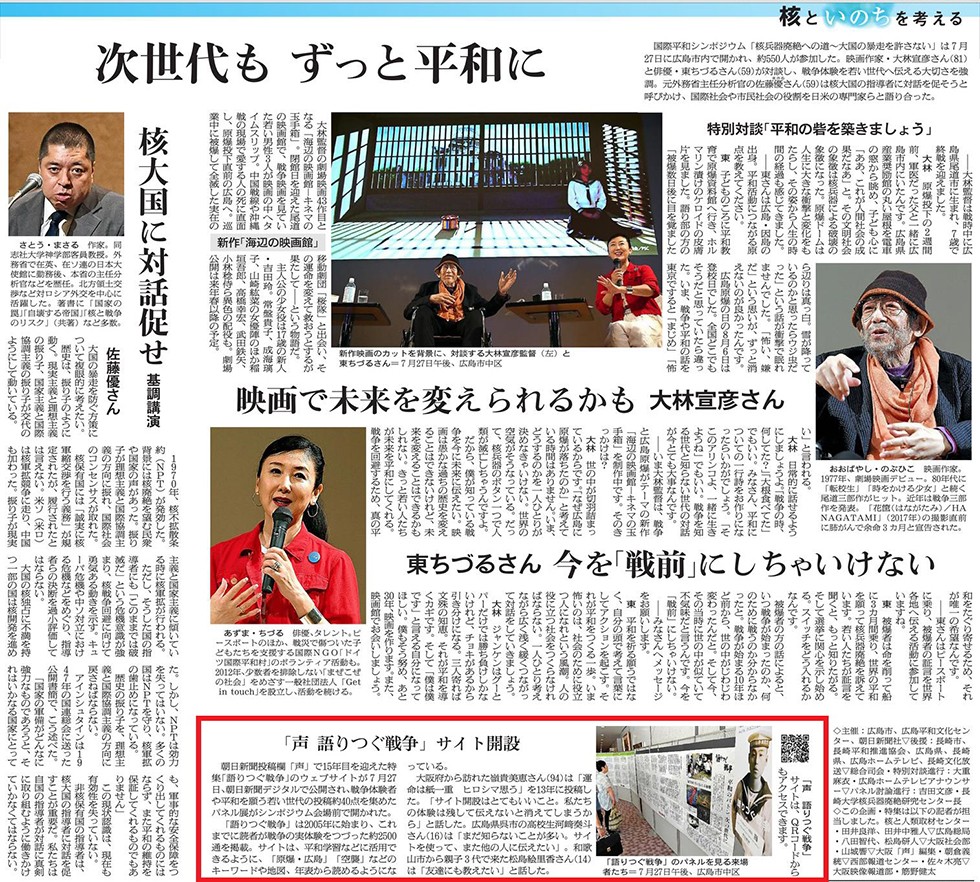 同年7月、広島市内で開かれた「国際平和シンポジウム」(朝日新聞社、広島市など主催)では、社内の「核と人類取材センター」と声編集が協力して、デジタルページの紹介動画を上映。会場入り口では「語りつぐ戦争パネル展」を企画し、多くの人に戦争投稿を読んでいただきました。