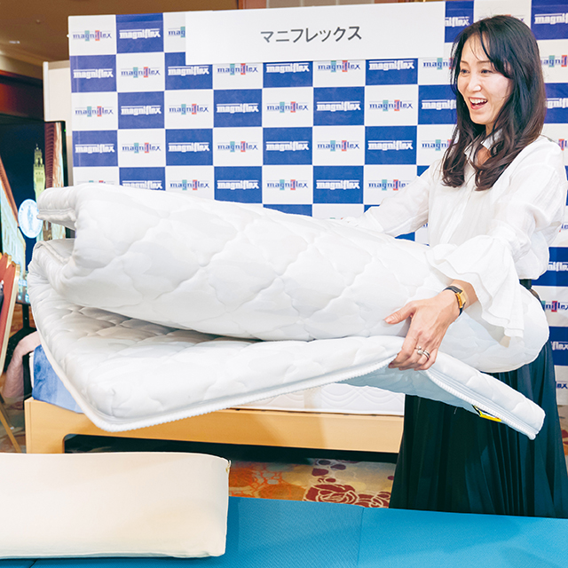 高反発マットレス「フラッグ・FX」とベッドパッド「エルゴ・トッパー」の組み合わせを試すと、「背中から腰にかけての負担がほとんどないですね。雲の上にいるようなふんわり感と、下からしっかりと支え上げてくれる感じが心地いい」と、マットレスによって眠りの質が変わることを実感したようです。